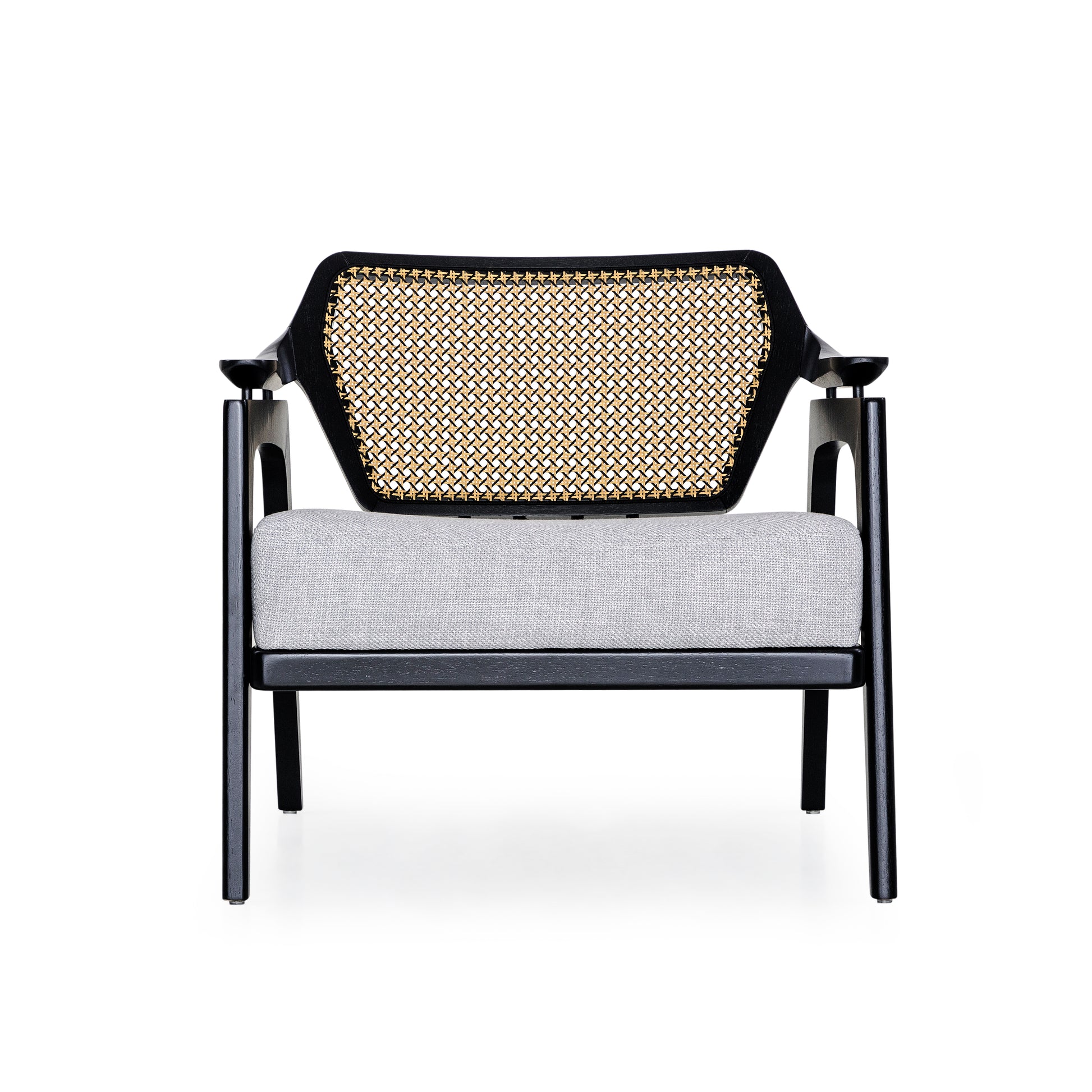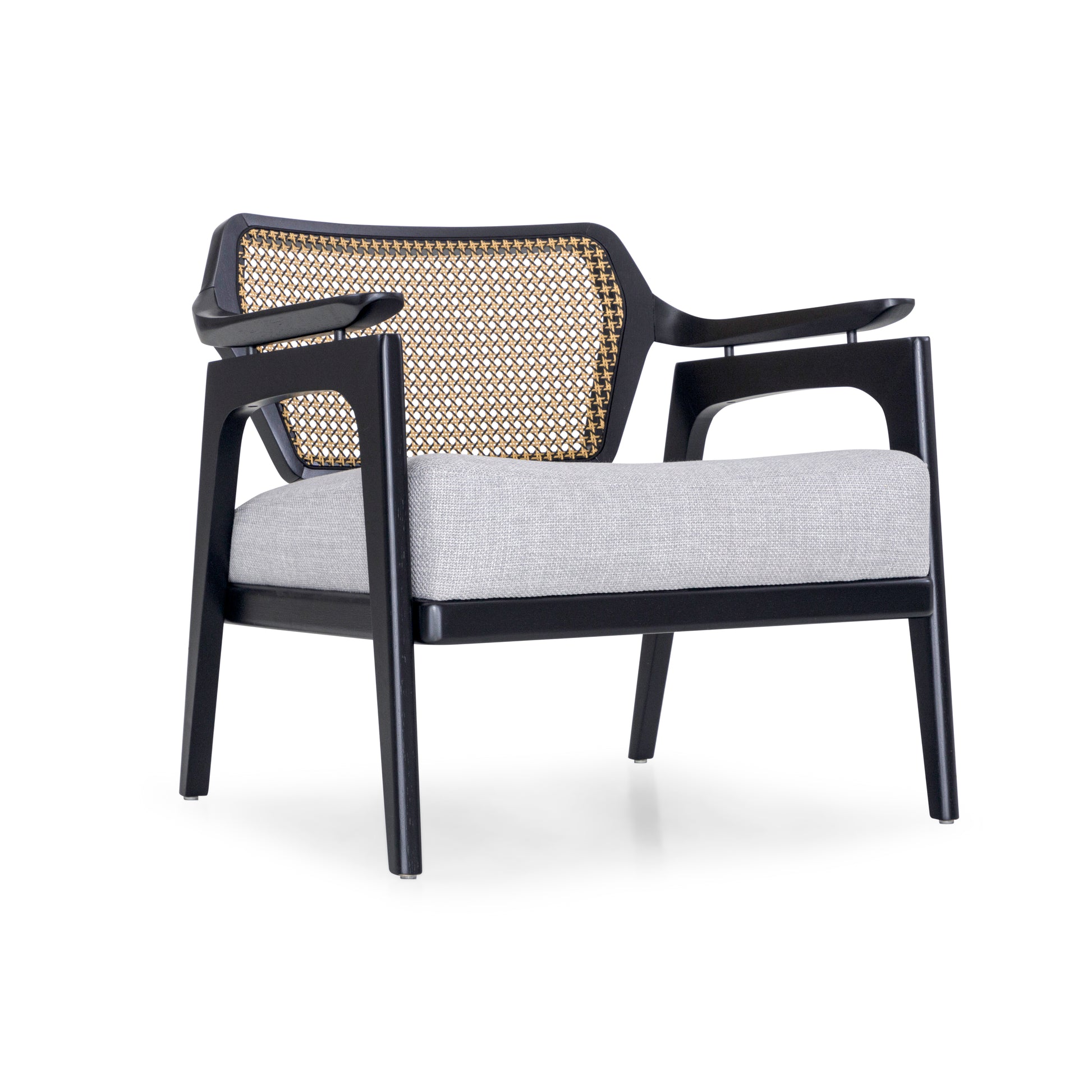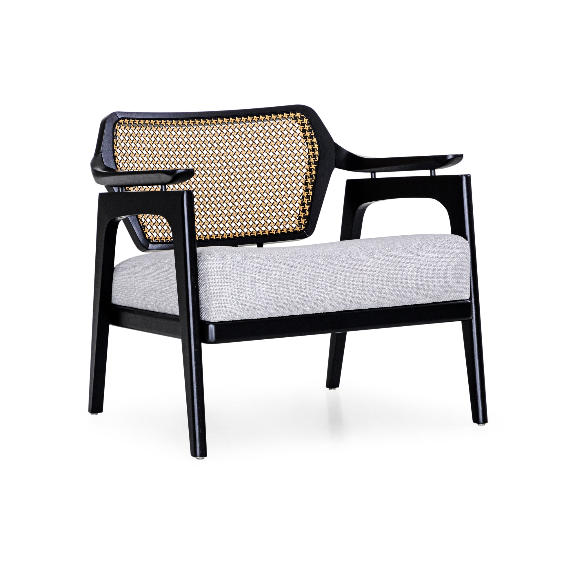 Introducing the Vanno armchair by Uultis, a distinguished Brazilian furniture company celebrated for its commitment to environmental sustainability and exceptional craftsmanship. The Vanno armchair is a perfect fusion of modern sophistication and traditional elegance, featuring a sleek black frame made from high-quality, eco-friendly materials. The armchair's standout feature is its intricately woven rattan backrest, which adds a touch of natural beauty and texture to the design.